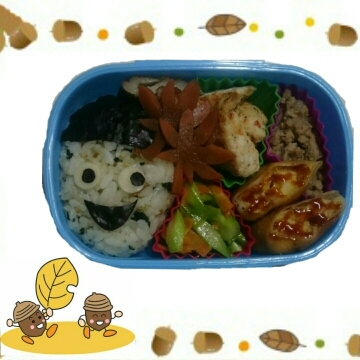 ゆっちゃんとパパ V Twitter 今日から秋休み と言っても5日間ですが という事で 今日と月曜日はお弁当です リスがどんぐりを のつもりでしたがリスに見えない お弁当 キャラ弁 秋休み 児童館 秋弁当 リス どんぐり もみじ 栗